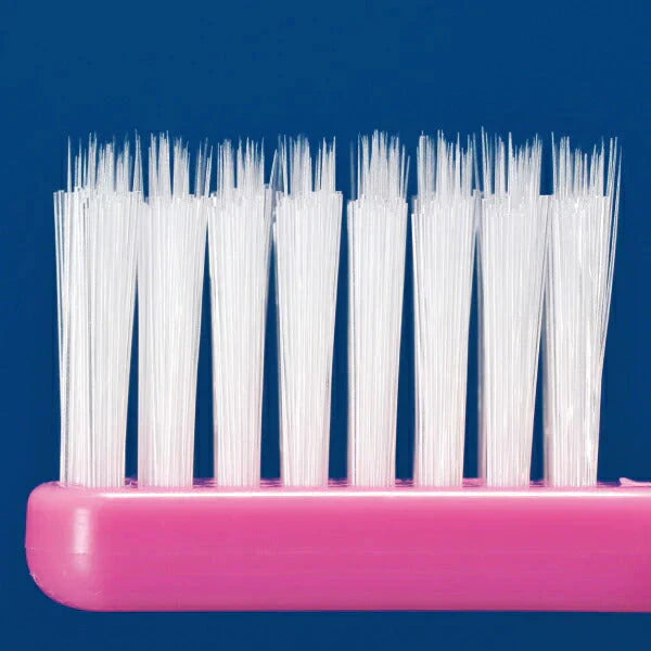 ラウンド毛材にPBT(ポリブチレンテフタレート)を採用。ナイロン毛より歯質摩耗性がありますが、価格、耐久性は優れています。 超先細毛は歯垢をやさしく除去できます。