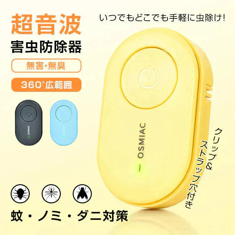 蚊除け 虫除け 「イエロー」 虫除け器 害虫駆除器 ダニ 蚊 ノミ 寄生虫 超音波撃退器 薬剤不使用 無害 無臭 電磁波 静音 省エネ 子ども ペット 携帯便利 クリップ付 害虫対策