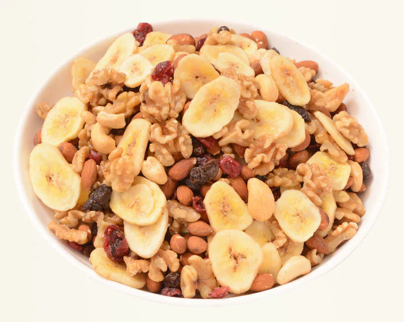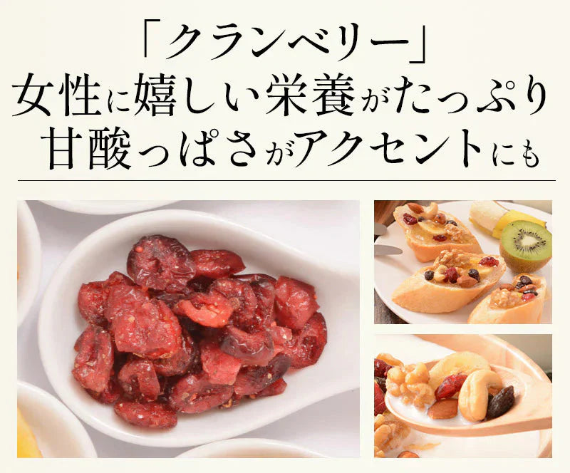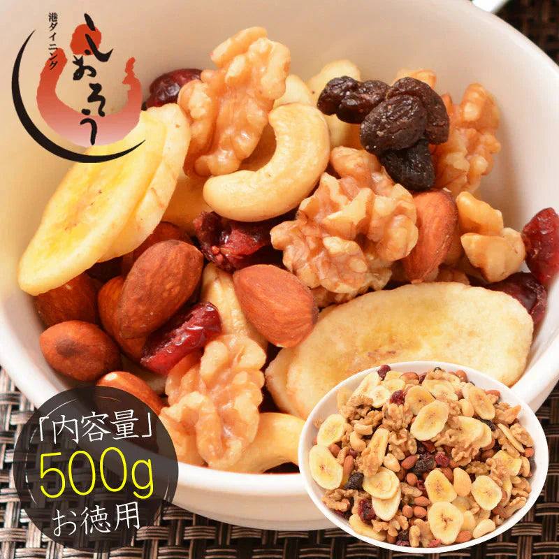 アーモンド(アメリカ産)、カシューナッツ(インド産)、クルミ(アメリカ産)、バナナチップス(バナナ、ココナッツオイル、砂糖)、ドライクランベリー(クランベリー、砂糖、植物油)、ぶどう(アメリカ産)