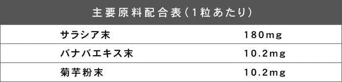 サラシア末(国内製造)、還元麦芽糖水飴、キクイモ粉末、バナバエキス末/結晶セルロース、ステアリン酸カルシウム、微粒二酸化ケイ素、増粘剤(プルラン)