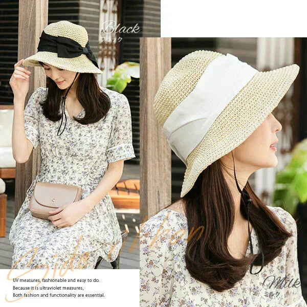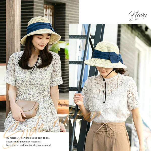 【フリー-ネイビー】【商品名:紐付き手編みストローHAT】