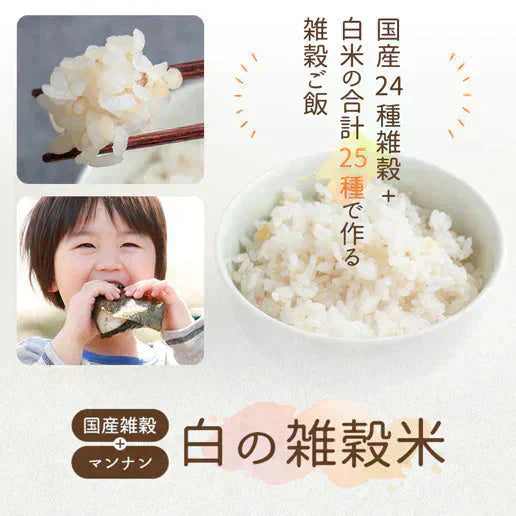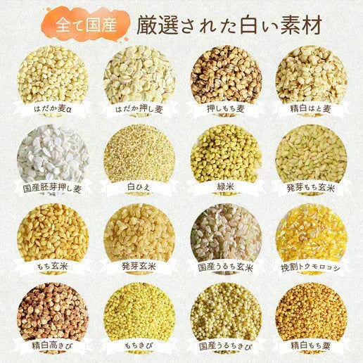 裸麦α(大麦(国産))、裸押し麦、もち玄米、押しもち麦、黄大豆(割り)、青大豆(割り)、うるち玄米、もち米、小豆(割り)、発芽玄米、緑米、発芽もち玄米、とうもろこし(割り)、インゲン豆(割り)、精白ひえ、精白高きび、精白うるち粟、精白もちきび、うずら豆(割り)、精白うるちきび、胚芽押し麦、米粒状こんにゃく加工食品、アマランサス、精白もち粟、精白はと麦/加工デンプン、グルコン酸Ca、増粘剤(アルギン酸Na)、調味料(有機酸)
