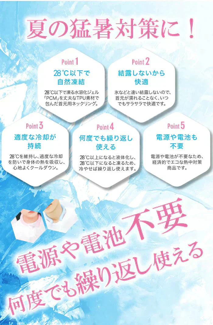 真夏の汗・熱中症対策に!心地良い温度で約60分~120分間"28度以下をキープ"してくれる、ネック用冷却グッズ。