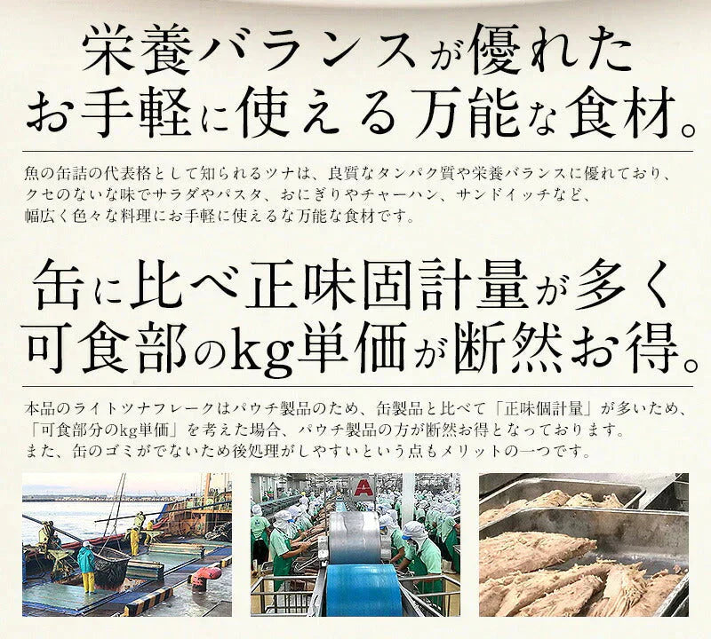 本品のライトツナフレークはパウチ製品のため、缶製品と比べて「正味個計量」が多いため、「可食部分のkg単価」を考えた場合、パウチ製品の方が断然お得となっております。また、缶のゴミがでないため後処理がしやすいという点もメリットの一つです。