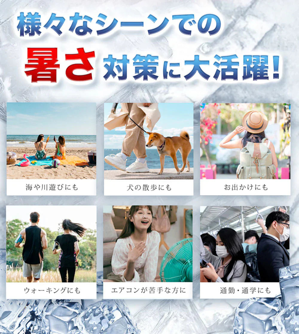 首元にフィットして落ちにくいデザイン。スポーツでアクティブに動く方や屋外で作業をする方、通勤・通学時、釣りをする方、家事をする方、ホットフラッシュが気になる方、クーラーのない空間での活動、お風呂上がりや気分転換など様々なシーンでお使いいただけます。