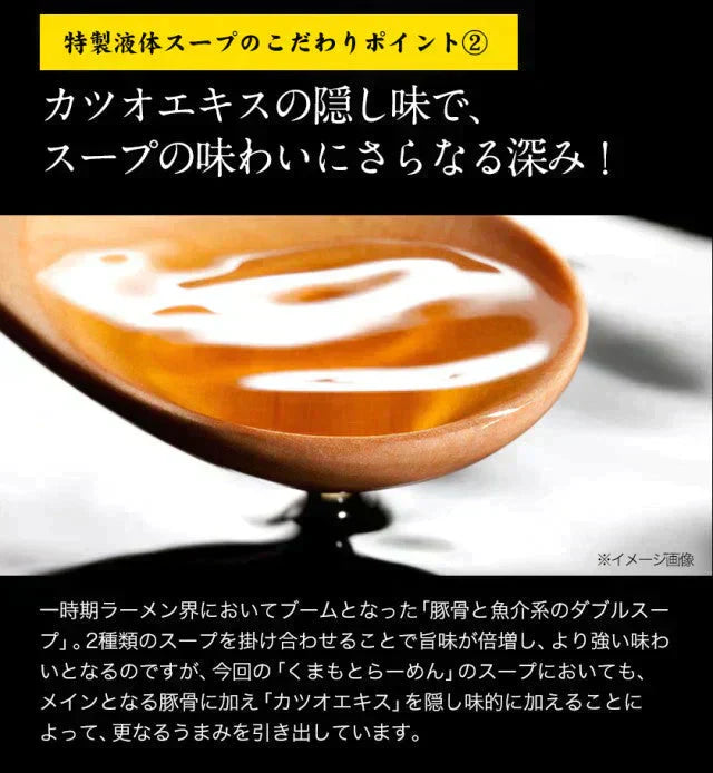 スープ:ポークエキス(国内製造)、豚脂、食塩、砂糖、しょうゆ、たん白加水分解物、香辛料、かつおエキス、香味食用油/調味料(アミノ酸等)、加工でんぷん、酒精、カラメル色素、増粘剤(グァーガム)、(一部に小麦・大豆・豚肉を含む)