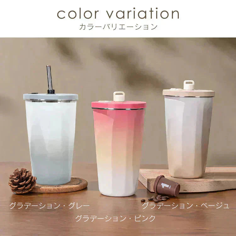 タンブラー 「グラデーション・ピンク」 蓋付き ストロー付き 水筒 600ml 大容量 保温 保冷 こぼれない コーヒーボトル マグボトル ステンレス 真空断熱 持ち運び