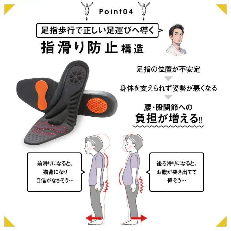 股関節補正機能が、内側傾斜を促し、身体の歪みを補正することで正しい歩き姿勢へ導きます。