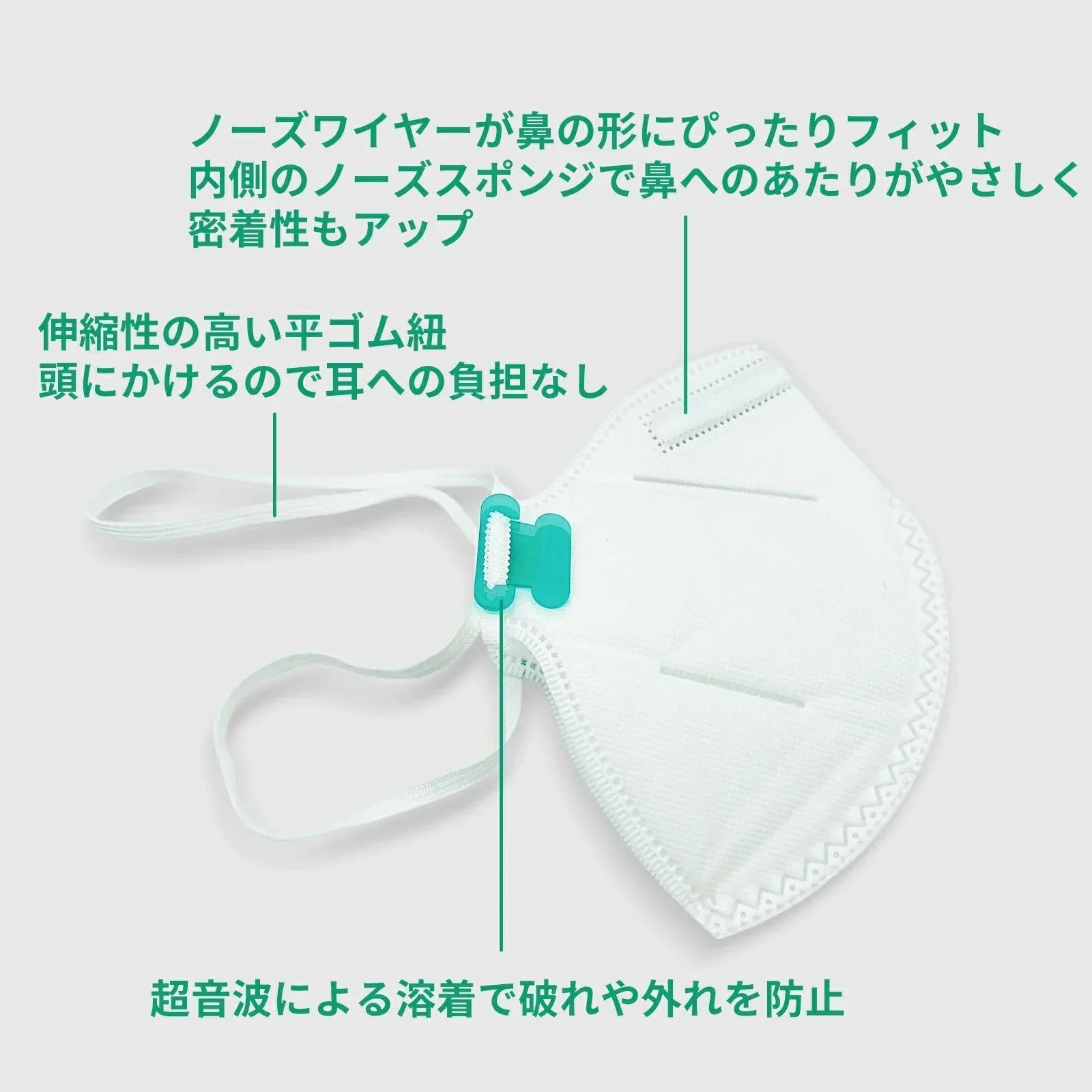 素材:本体・フィルタ部(ポリオレフィン、ポリエステル)、紐部(ポリウレタン)、ノーズクランプ部(鉄、ポリオレフィン)