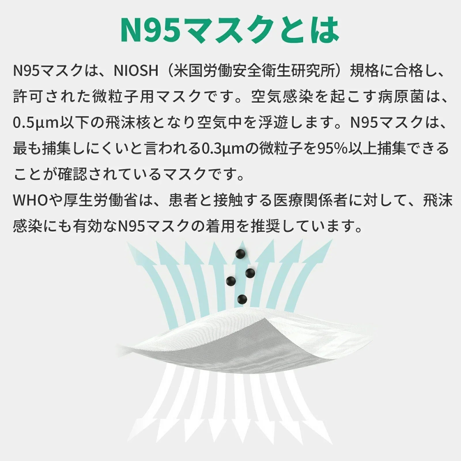つまりN95マスクは、5μm以下の飛沫核に付着した病原体を捕集することができ、