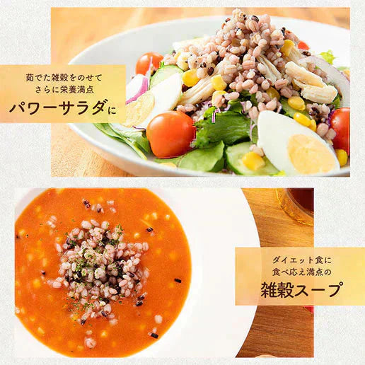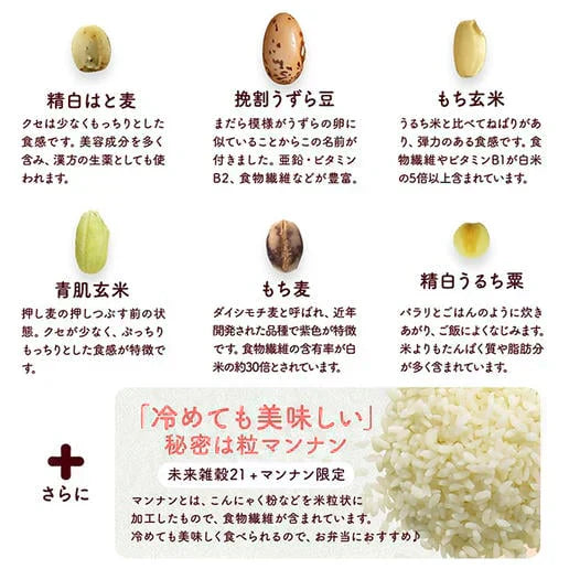 裸麦α(大麦(国産))、黒米、裸押し麦、もち麦、赤米、黄大豆(割り)、黒千石大豆、青大豆(割り)、黒大豆(割り)、青肌玄米、小豆(割り)、発芽玄米、緑米、米粒状こんにゃく加工食品、精白ひえ、インゲン豆(割り)、精白もち栗、精白もちきび、精白はと麦、精白うるち栗、うずら豆(割り)、発芽もち玄米/加工デンプン、グルコン酸Ca、増粘剤(アルギン酸Na)、調味料(有機酸)