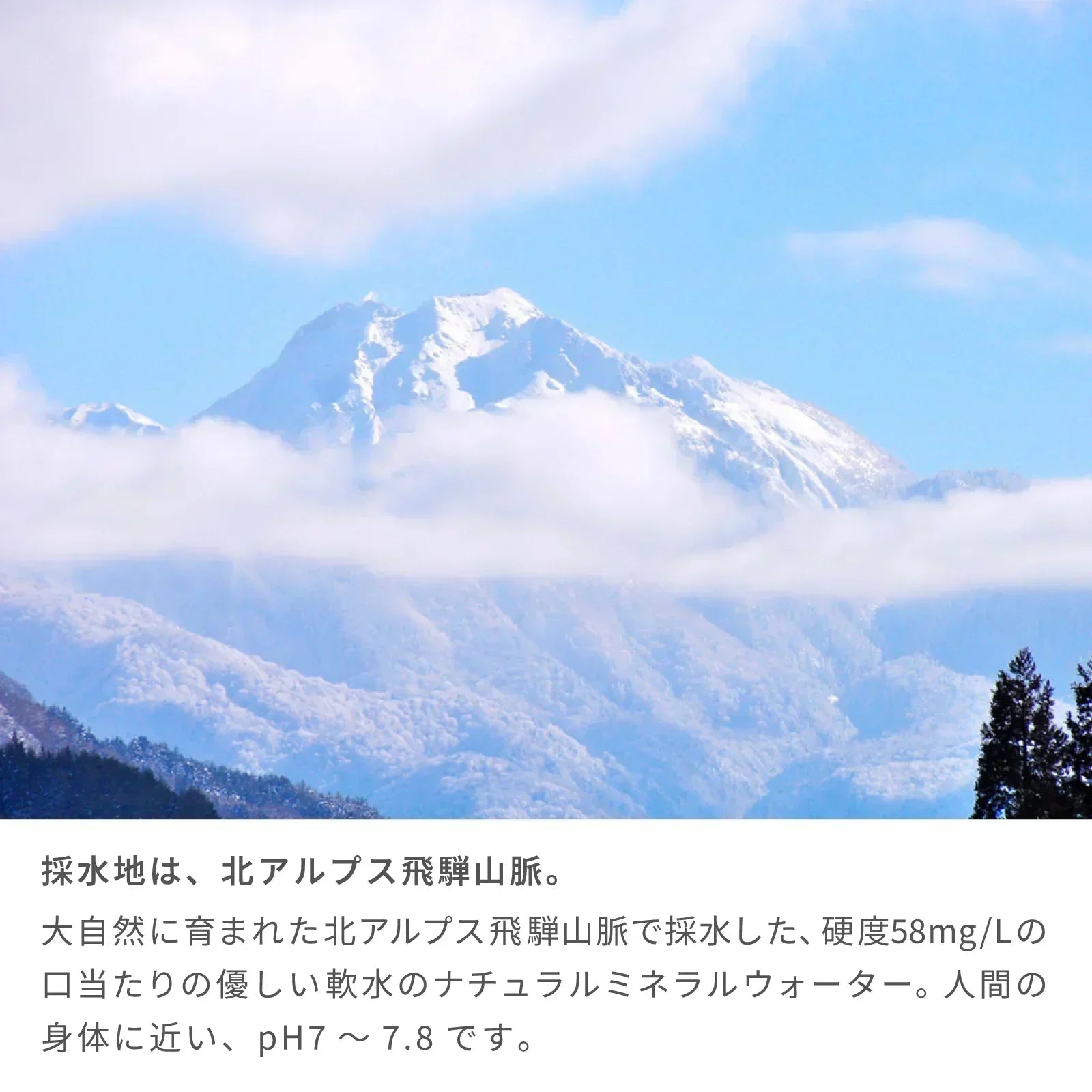 大自然に育まれた北アルプス飛騨山脈で、採水した、硬度58mg/Lの口当たりの優しい軟水のナチュラルミネラルウォーター。人間の身体に近い、pH7~7.8です。